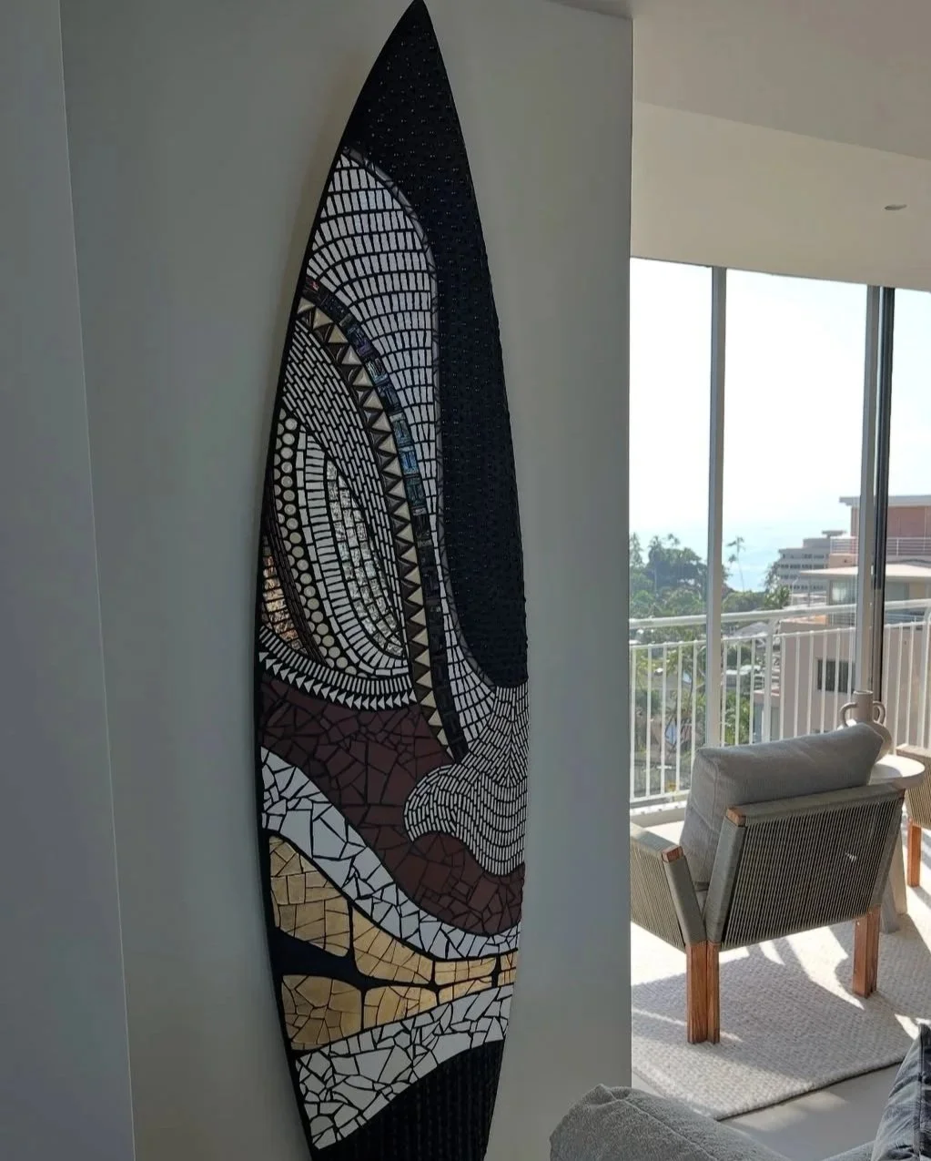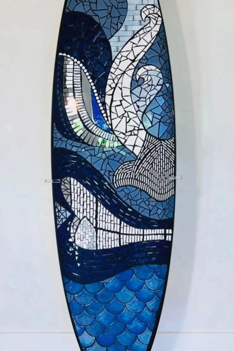 A mosaic art piece on a surfboard featuring a swan and ocean waves in shades of blue, black, and white.