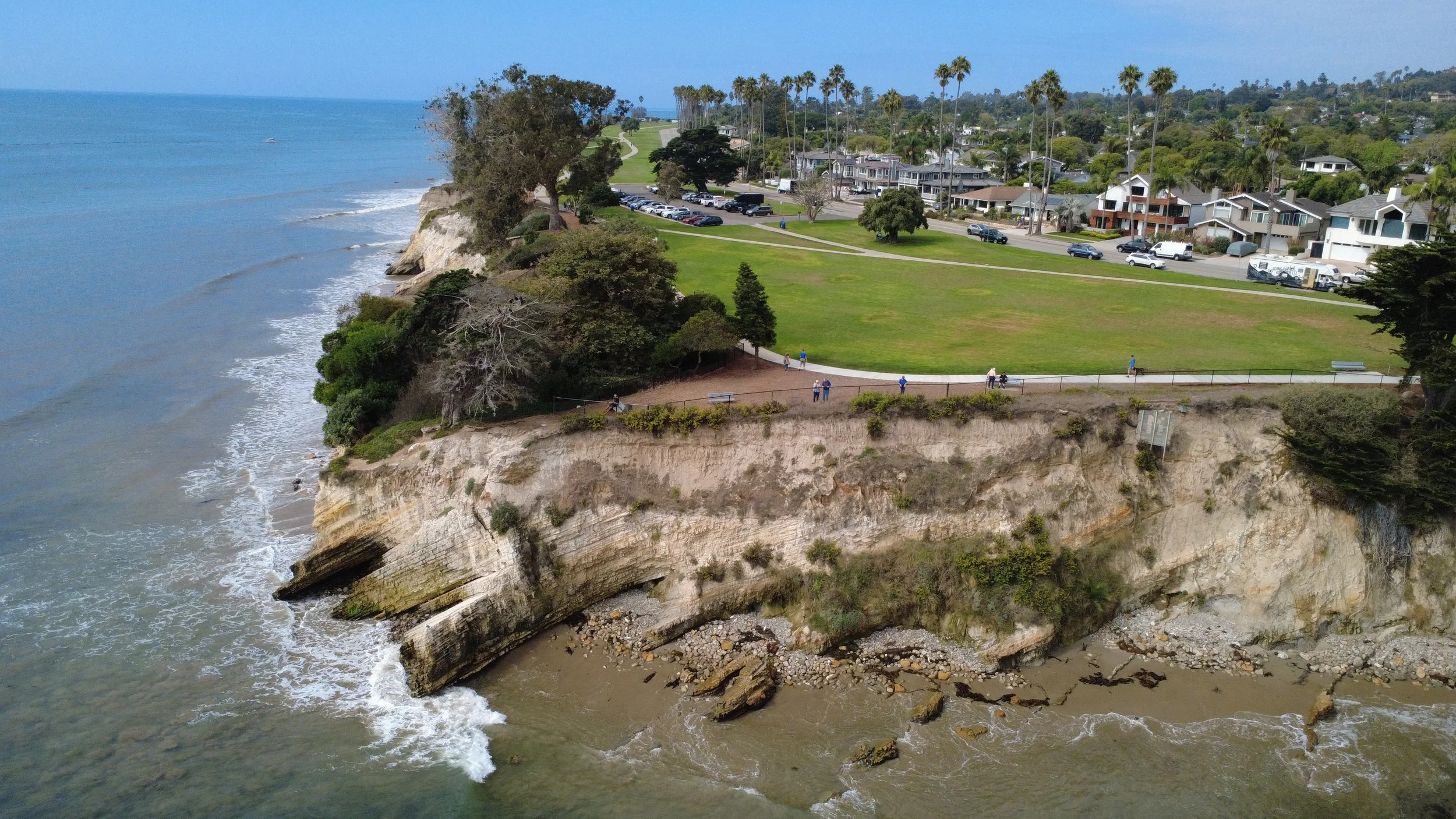A coastal cliffs with trees, a walking path, and houses in a neighborhood behind, overlooking the ocean.